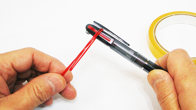 切ったセロテープを、ボールペンのクリップ部分にくるくるっと巻きます。