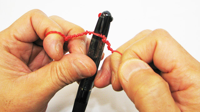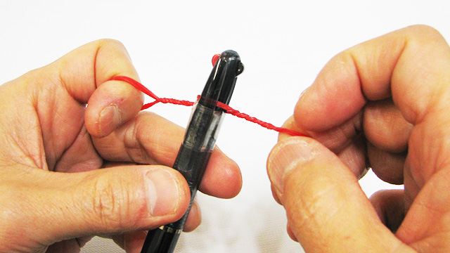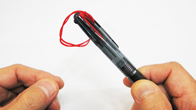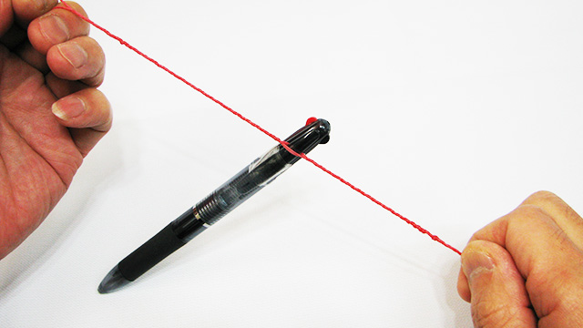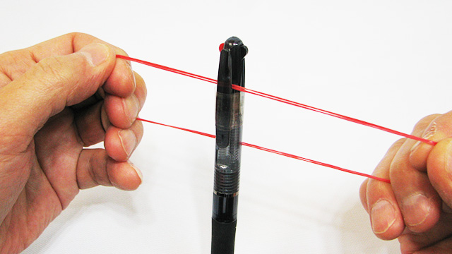 輪ゴムを左右に引っ張り、ボールペンを先ほどとは逆に回転させます。
