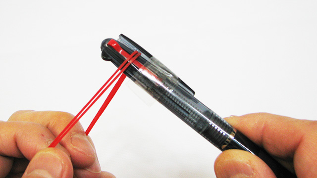 まず、輪ゴムの輪の中にボールペンを入れ、クリップ部分に通します。