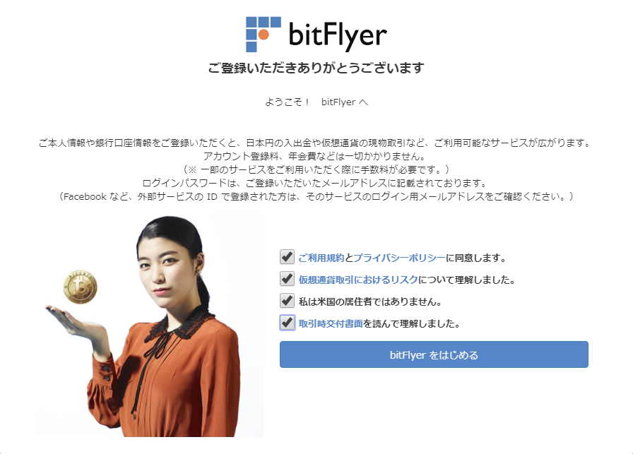 プライバシーポリシーやリスクについてなど4項目にチェックを入れて『bitFlyerをはじめる』をクリック。