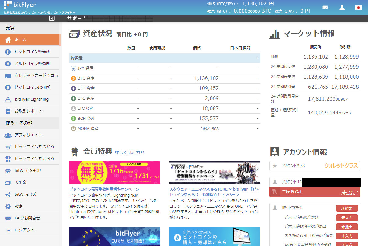 本人確認やら二段階認証など、まだ何も設定していないので使えませんが、すぐに管理画面に入ることができました。