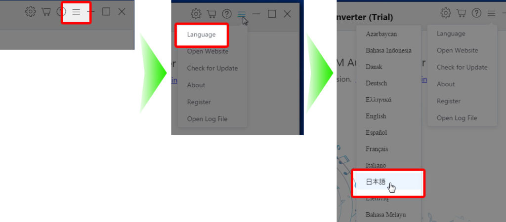 ソフト画面の右上の方にある『メニュー(三本線)』⇒『Language』⇒『日本語』をクリックします。