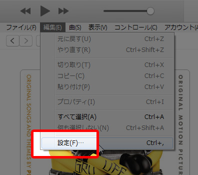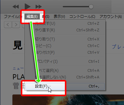 iTunesのメニューから『編集』⇒『設定』をクリックします。