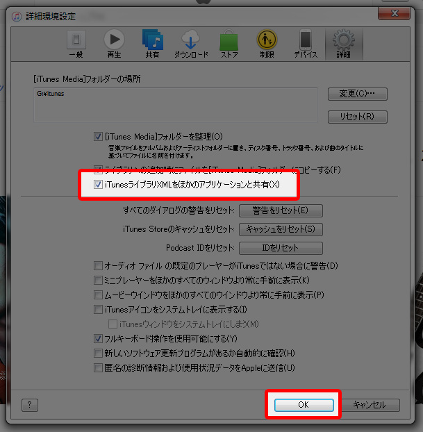 iTunesライブラリXMLをほかのアプリケーションと共有』にチェックを入れて『 OK 』をクリックします。