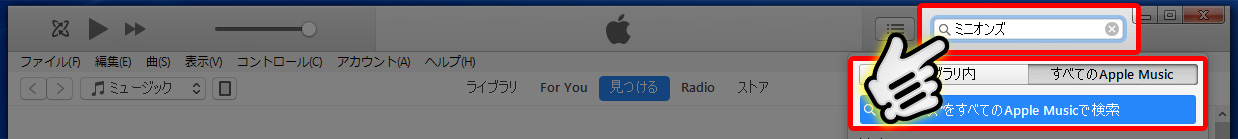 まずはiTunesを起動し、右上にある検索窓に『アーティスト名』『タイトル』などを入力して検索します。この時、検索対象は『すべてのApple Music』をクリックして選択しましょう。検索窓へ文字を入力すると、その下に『ライブラリ内』『すべてのAppleMusic』が現れます。