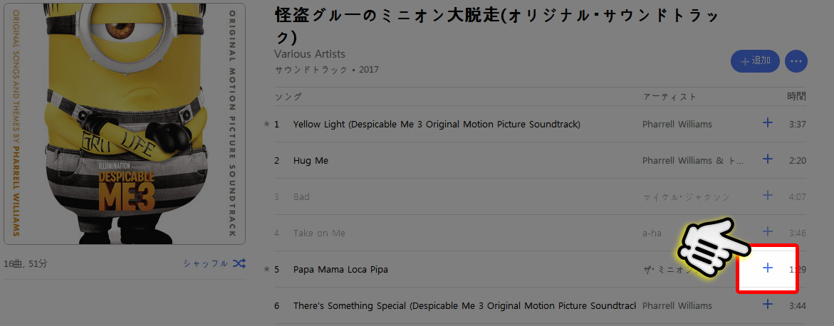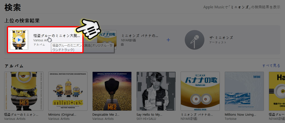 今回は体験版で説明しているので、変換可能な3分以内の音楽ということで、『ミニオンズ』を検索。検索一覧が表示されるので、ダウンロードしたい『アルバム』をクリックします。※アルバムじゃなくてシングルCDでもOK!!!