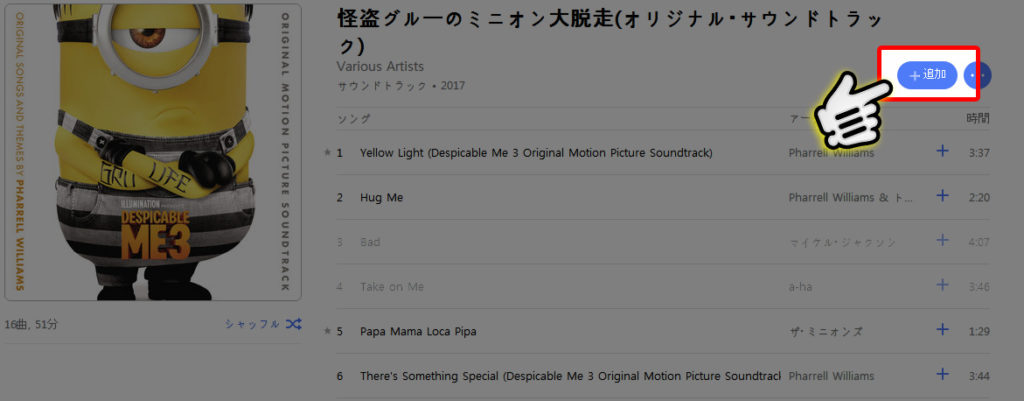 音楽単体ではなく、アルバムごと全てをダウンロードしたい場合は、『+追加』をクリックします。