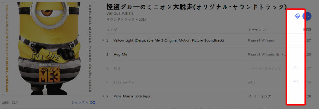 ダウンロードできない曲がある場合は、色は薄いグレーのままですが、+マークがドットの雲マークになります。