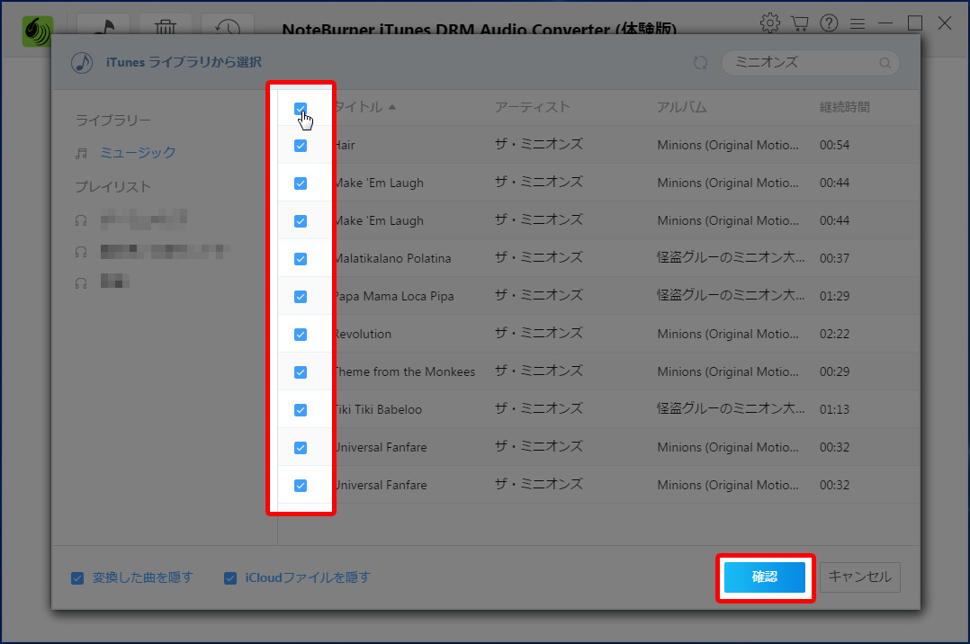 変換したい曲の左にあるチェックボックスにチェックを入れ『確認』ボタンをクリックします。※全てにチェックを入れたい場合は一番上のボックスにチェックを入れると全てのボックスにチェックが入ります。