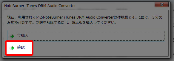 『体験版は1曲につき3分までしか変換できませんよ~』と出るので『確認』ボタンをクリックします。