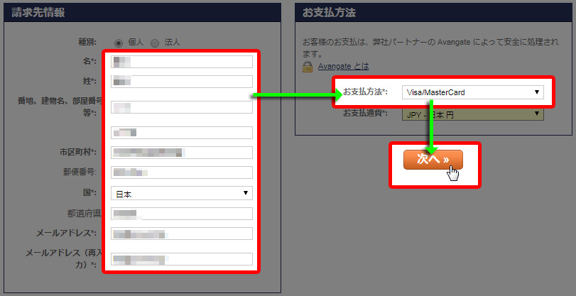 画面を下にスクロールすると、購入者情報と支払い方法選択の項目がありますので、必要事項を全て入力して『次へ』をクリックします。