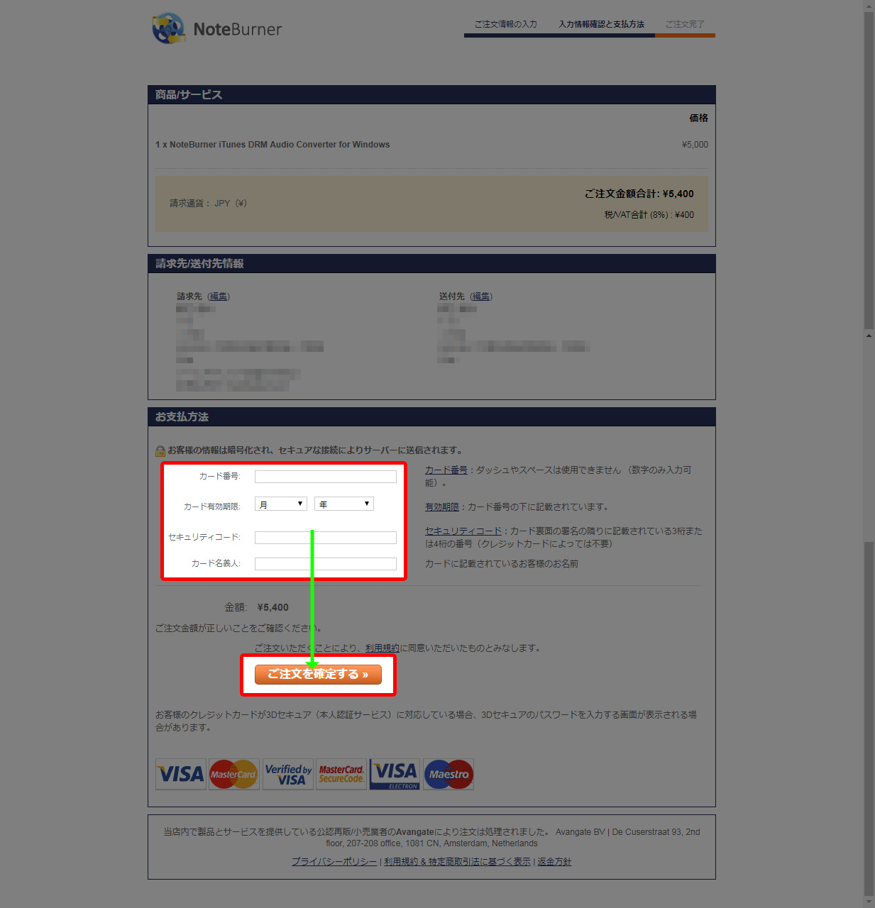 カード情報を入力し、最後に『ご注文を確定する』をクリックします。