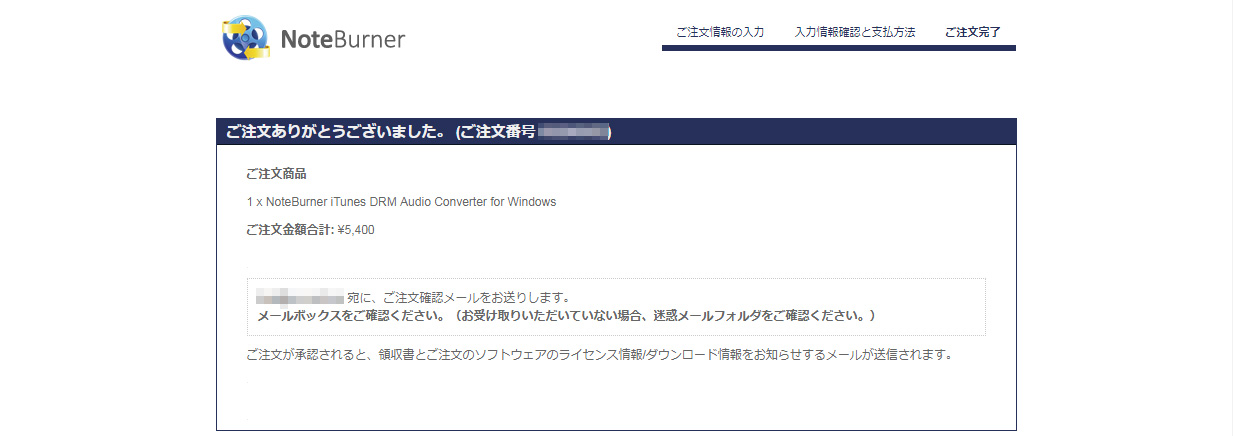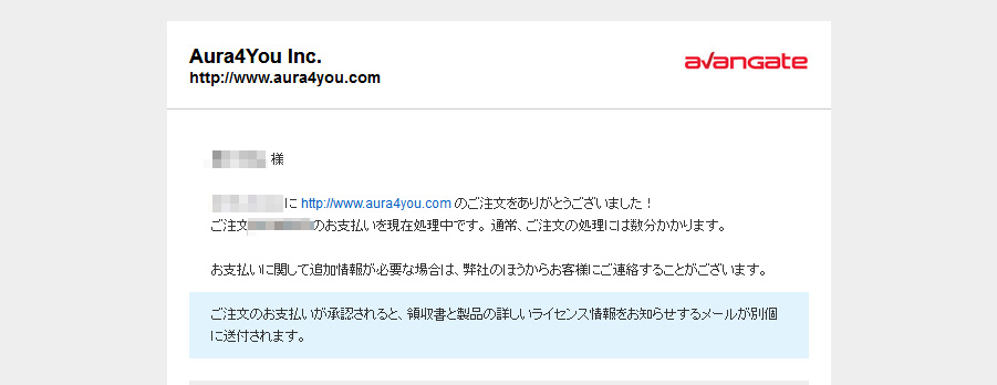 支払い処理が受領されると正式に注文が完了し、ライセンス等が書かれたメールが送られてきます。