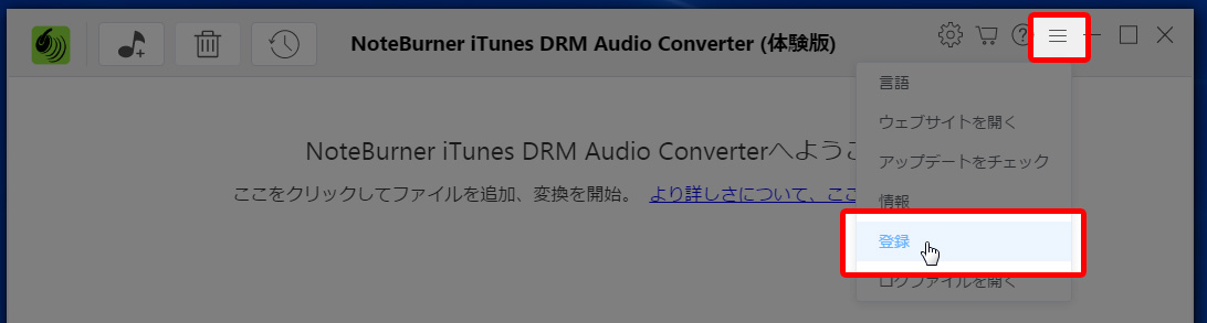 NoteBurner iTunes DRM Audio Converterを起動し、『右上のメニュー(三本線)』⇒『登録』をクリックします。