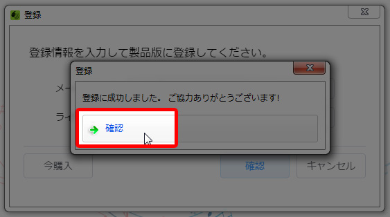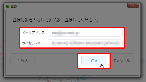 購入時に入力した『メールアドレス』と、届いたメールに記載されている『製品/サブスクリプションキー』を入力して『確認』ボタンをクリック