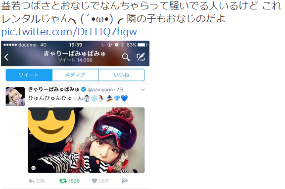 二人がスキーウェアを着て移っている写真が益若さんのインスタにアップされていたのですが、その画像が削除されたのと、きゃりーぱみゅぱみゅーこときゃりーちゃんが益若つばさが着ていたスキーウェアと同じデザインのものを着ている写真がツイートされたことで、ネット上ではちょっとしたお祭り騒ぎみたいになっていました。