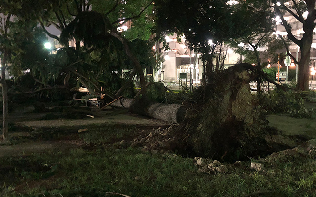 街路樹もあちこちで倒れており、道路に散乱している状態ですね。