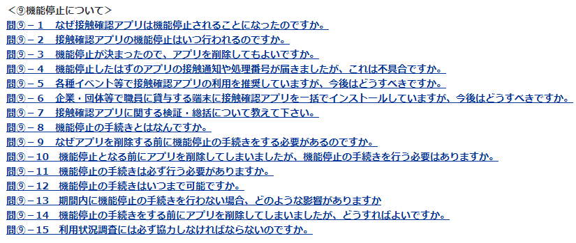 機能停止版の質問が掲載されている部分 ⇒ https://www.mhlw.go.jp/stf/seisakunitsuite/bunya/kenkou_iryou/covid19_qa_kanrenkigyou_00009.html#cocoa9