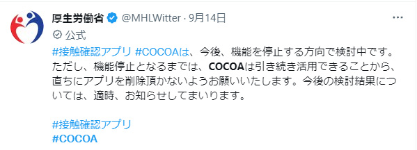 新型コロナウイルス接触確認アプリ「COCOA」が機能を停止する。と発表しました。