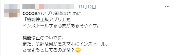 このことから既にアンインストールしているユーザーも少なくないのではないかと思うが、既にCOCOAを削除してしまっているユーザーは、定期的にインストールされてもいないアプリの影響でスマホへ負担をさせ続けてしまうことになる。